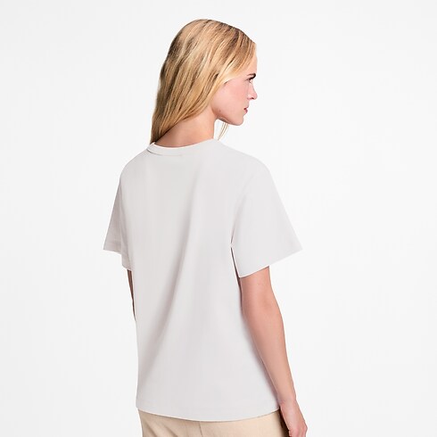 Dieses T-Shirt ist ein zeitloses, unverzichtbares Design aus weichem Baumwolljersey, das in einer vielseitigen, geraden Form mit einem gerippten Rundhalsausschnitt gefertigt ist. Die Brust wird durch eine aufgesetzte Tasche mit einem farbenfrohen, gestreiften Motiv akzentuiert, während ein glänzender Schmuckknopf dem Look eine verspielt-elegante Note verleiht.