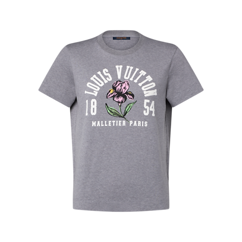 Dieses klassische T-Shirt mit Rundhalsausschnitt ist aus weichem Baumwolljersey in einer legeren, geraden Form gefertigt, die angenehme Looks für jeden Tag ermöglicht. Die Brust ziert ein grafisches Varsity-Motiv mit Louis Vuitton Signatur, das das elegante Iris-Motiv dieser Saison umrahmt und so einen raffinierten Dialog zwischen sportiven und romantischen Codes schafft.