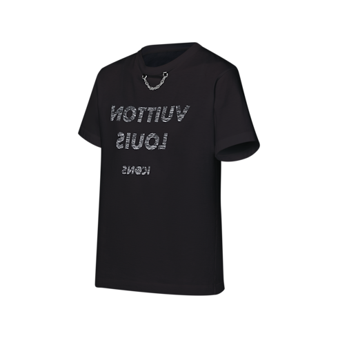 Eine spiegelverkehrte Louis Vuitton Signatur verleiht diesem schlichten T-Shirt eine verspielte Note. Das Motiv ist in einem unverkennbaren, marmorierten Look auf Baumwolljersey gedruckt. Das ikonische Ketten-Detail des Hauses Louis Vuitton rundet das edle Design ab.