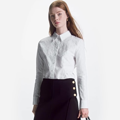 Mit seiner ikonischen Form ist dieses taillierte, langärmelige Hemd ein modisches Highlight in der Damengarderobe. Das weiche Gewebe aus Baumwollpopeline ist mit einem eleganten durchgängigen Fil Coupé mit Monogram-Motiv verziert. Auf dem Ärmel sorgt eine Schlaufe mit Monogram-Blüte für eine weitere Signatur.