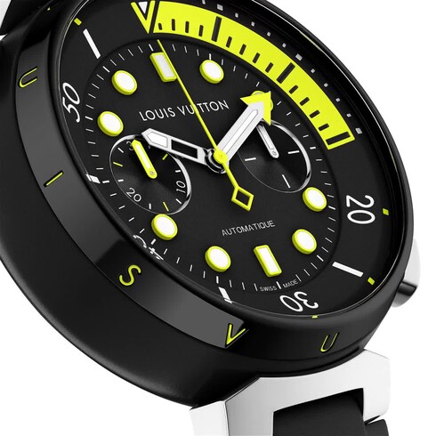Die Tambour Street Diver Chronograph Armbanduhr bereichert die Street Diver Linie mit einer unverzichtbaren Komplikation (Zusatzfunktion des mechanischen Uhrwerks). Die Funktion dieses Chronografen unterstreicht den Anspruch des Hauses Louis Vuitton, eine funktionale und gut ablesbare Kollektion anzubieten, und verleiht diesen Modellen einen noch vielseitigeren Charakter. Der auf Präzision ausgelegte Street Diver Neon Black Chronograph präsentiert sich mit einem perfekt proportionierten Tambour Gehäuse, sich farblich abhebenden Finishs sowie mit leuchtenden Indizes. Er rundet jeden Look mit einem sportiven, auffallenden Akzent ab.
