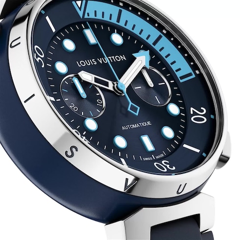 Die Tambour Street Diver Chronograph Armbanduhr bereichert die Street Diver Linie mit einer unverzichtbaren Komplikation (Zusatzfunktion des mechanischen Uhrwerks). Die Funktion dieses Chronografen unterstreicht den Anspruch des Hauses Louis Vuitton, eine funktionale und gut ablesbare Kollektion anzubieten und verleiht diesen Modellen einen noch vielseitigeren Charakter. Dieses Modell interpretiert die ästhetischen Elemente der mit dem GPHG-Preis ausgezeichneten Armbanduhr aus dem Jahr 2021 neu. Der auf Präzision ausgelegte Skyline Blue Chronograph präsentiert sich mit einem perfekt proportionierten Tambour Gehäuse, sich farblich abhebenden Finishs sowie mit leuchtenden Indizes. Er rundet jeden Look mit einem sportiven, maritimen Akzent stilvoll ab.
