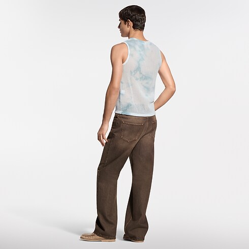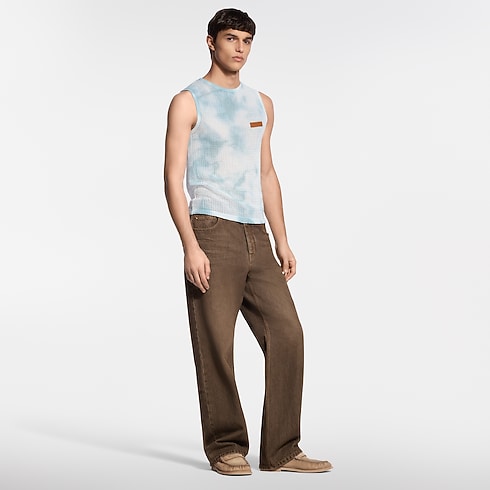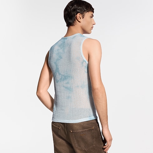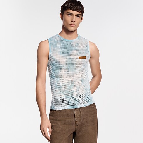 Dieses hellblaue Tanktop aus Baumwoll-Netzgewebe ist von den indischen Einflüssen in der Frühjahr Sommer 2026 Fashion Show inspiriert. Ein marmoriertes Finish in Stückfärbung sorgt bei jedem Modell für einen sonnengebleichten Effekt und macht es zu einem Unikat. Ein Louis Vuitton Paris Patch aus Leder ziert die Brust auf der linken Seite. Gerippte Besätze bilden an den Armausschnitten und dem Kragen ein elegantes Finish. Dieses legere Kleidungsstück lässt sich perfekt mit den subtilen Farben und Strukturen dieser Saison kombinieren.