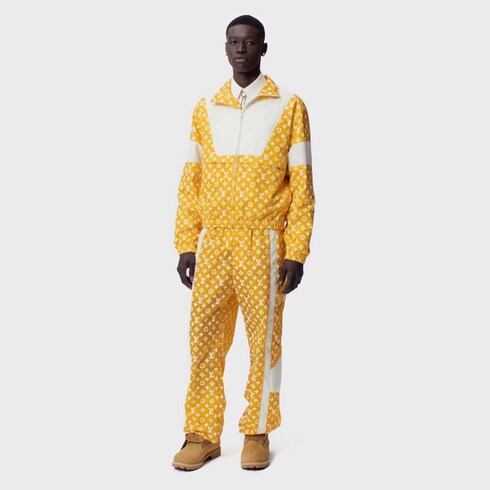 Ein durchgängiges gedrucktes Monogram-Motiv zeichnet diese sportive gelbe Trainingsjacke von der Herbst Winter 2024 Fashion Show aus. Von dem grafischen Motiv hebt sich ein weißer Einsatz farblich ab. An der Rückseite erinnert ein Louis Vuitton Aufnäher mit einem gestickten LV Ropes-Motiv an die Western-Thematik dieser Kollektion. Mit der dazu passenden Trainingshose kann dieses Modell zu einem modischen Gesamtlook kombiniert werden.