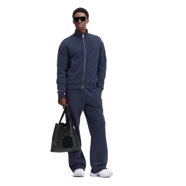 Diese dunkelblaue Trainingsjacke aus Baumwolljersey verleiht legeren Outfits für den Alltag eine elegante Note des Hauses Louis Vuitton. Das Modell aus weichem Strick zeigt sich mit einem durchgehenden Monogram-Motiv in einer geprägten Optik. Das vielseitige Kleidungsstück ist ideal für Reisen und lässt sich mit der dazu passenden Hose zu einem stilvollen Ensemble kombinieren.