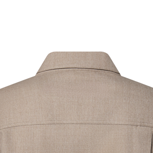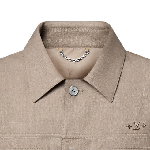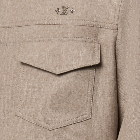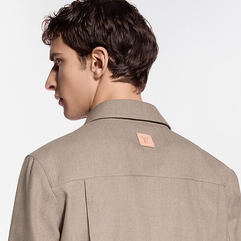 Das Modell aus einem zeitlosen, beigefarbenen Woll-Seiden-Twill ist mit Knöpfen in Perlmuttoptik sowie feinen Signaturen auf der Brust versehen, Ein LV Patch aus Leder ziert die Rückseite. Das mühelos elegante Kleidungsstück ist perfekte als leichte, äußere Lage für wärmere Tage.