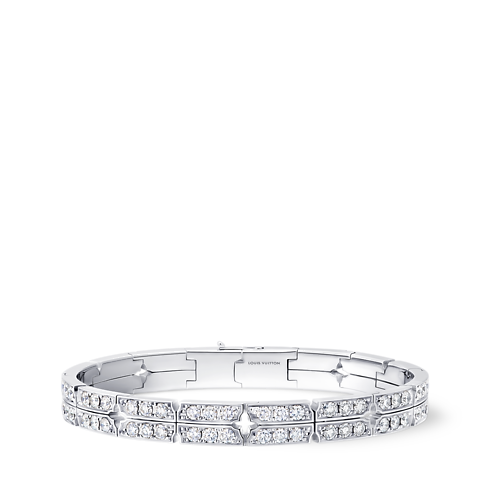 Das Tumbler Armband ist von dem Erbe des Hauses Louis Vuitton als Koffermacher inspiriert und vereint dessen meisterhafte Goldschmiede-Handwerkskunst mit einer dezenten Signatur. Die durchgängig mit funkelnden Diamanten besetzten und detailgenau geformten Kettenglieder aus Weißgold weisen Cut-outs in Form von Monogram-Blüten auf und sorgen mittels geschmeidiger Verbindungen für eine perfekte Passform. Ein zeitloses Unisex-Schmuckstück, welches zu jedem Look einen funkelnden Akzent setzt.