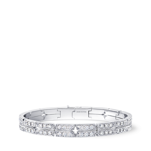 Das Tumbler Armband ist von dem Erbe des Hauses Louis Vuitton als Koffermacher inspiriert und vereint dessen meisterhafte Goldschmiede-Handwerkskunst mit einer dezenten Signatur. Die durchgängig mit funkelnden Diamanten besetzten und detailgenau geformten Kettenglieder aus Weißgold weisen Cut-outs in Form von Monogram-Blüten auf und sorgen mittels geschmeidiger Verbindungen für eine perfekte Passform. Ein zeitloses Unisex-Schmuckstück, welches zu jedem Look einen funkelnden Akzent setzt.