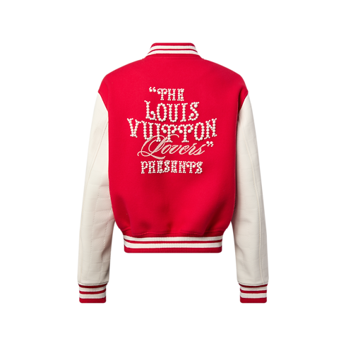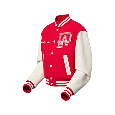 Bei diesem leuchtend roten Varsity Blouson verschmilzt das Savoir Faire des Hauses Louis Vuitton mit einem Teil amerikanischer Tradition: Das Design ist von Pharrell Williams’ Vergangenheit als Schlagzeuger im Spielmannszug der Princess Anne High School (Virginia) inspiriert. Das ikonische Kleidungsstück von der Frühjahr Sommer 2024 Fashion Show besitzt weiße Ärmel aus Kalbsleder mit dem Damier-Motiv als Prägung. Eine Louis Vuitton Signatur mit Perlenstickerei auf der Rückseite und ein mit Strass bestickter „PA“-Aufnäher auf der Brust erinnern an Williams’ Jugend.