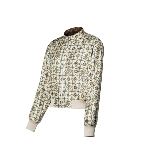 Eine Seite dieser Bomberjacke bildet eine Hommage an die Wurzeln des Hauses Louis Vuitton im Art Nouveau. Sie ist durchgängig mit einem eleganten, floralen Motiv versehen, welches dezent mit ikonischen Louis Vuitton Signaturen durchsetzt ist. Die Rückseite zeigt ein klassisches Monogram-Motiv in der Jacquard-Technik mit sich farblich abhebenden Akzenten aus Wolle. Ein Reißverschluss und ein Kragen mit einem Druckknopf verleihen dem Modell aus einem weichen Seiden-Twill ein modisches Finish.