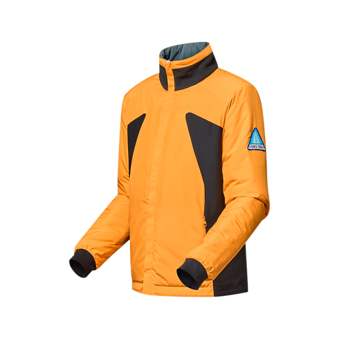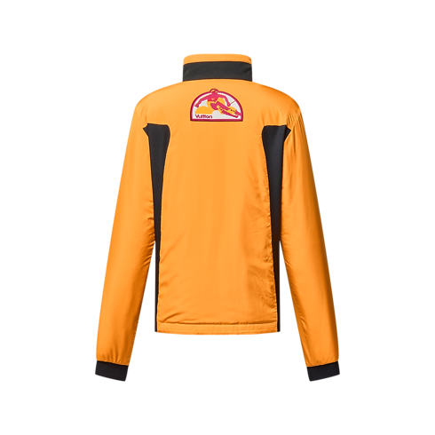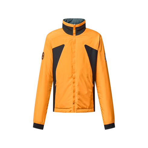 Dieses vielseitige technische Modell kann allein oder unter eine Ski-Shelljacke getragen werden. Es ist wendbar und leicht wattiert. Auf einer Seite präsentiert es sich in neutralen Grautönen und auf der anderen Seite in einem auffallenden Orange. Die schwarzen seitlichen Einsätze auf der grauen Seite sind mit einem Ton in Ton gehaltenen, durchgängigen Monogram-Motiv verziert. Auf der orangefarbenen Seite setzen Aufnäher mit gestickten Signaturen und Ski-Motiven sportive Vintage-Akzente.