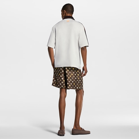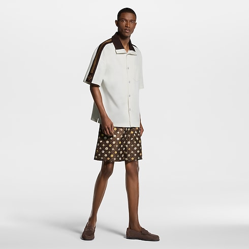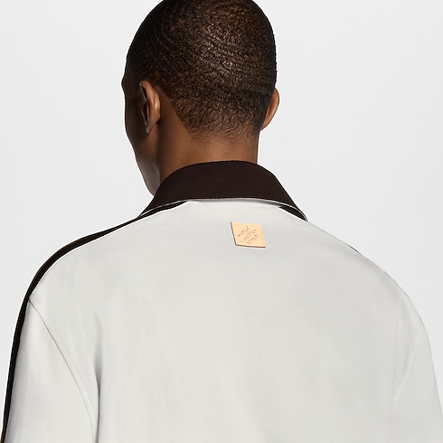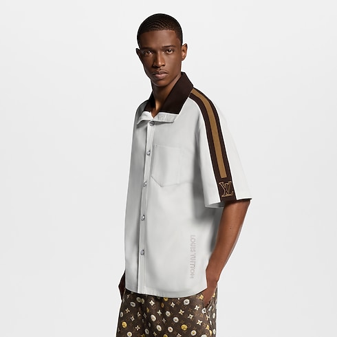 Dunkelbraune, gerippte Einsätze verleihen diesem kurzärmeligen weißen Hemd aus Baumwollpiqué einen grafischen Akzent. Charakteristische, bestickte Bänder zieren die Schultern und Ärmel, während der braune, geknöpfte Kragen sowohl hochgeschlossen wie ein Rollkragen als auch offen getragen werden kann. Der gestickte Louis Vuitton-Schriftzug auf der linken Körperseite sorgt für eine sportive Note. Dieses Modell lässt sich mit den fließenden Hosen und Shorts der Kollektion zu einem Look im Preppy-Stil kombinieren.