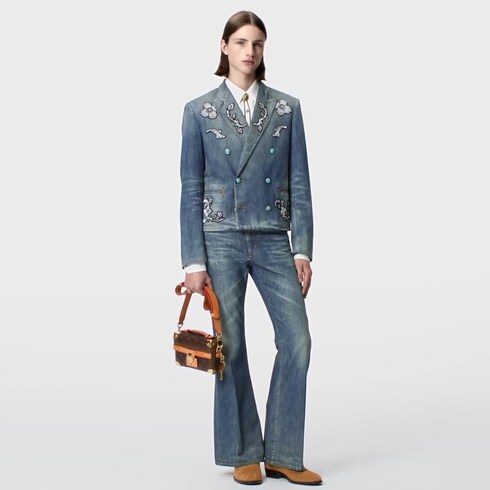 Dieses elegante Jackett aus vorgewaschenem Denim greift mit der Wild-West-Thematik ein Schlüsselthema der Herbst Winter 2024 Fashion Show auf. Das kurze, zweireihige Design ist mit türkisfarbenen Knöpfen und floralen Aufnähern samt aufgestickten Pailletten verziert. Zudem setzen aufgestickte Monogram-Blüten an den horizontal angeordneten, paspelierten Taschen dezente Akzente. Eine „Marque L. Vuitton Déposée“ Signatur am Rücken vervollständigt das Modell.